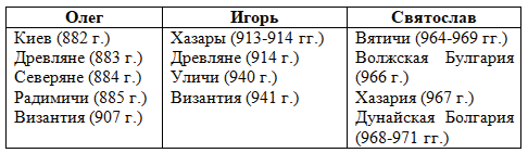 Олег стремился создать единое государство, путём объединения восточных славян. Игорь боролся с внешними врагами Руси. Святослав совершил большое количество походов, закончившихся разгромом врагов Руси, а также присоединил к Руси вятичей, то есть одновременно боролся с внешними врагами и объединял славян.