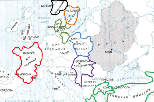 Задание 4. На контурной карте обведите страны, с которыми Русь при Ярославле Мудром была связана династическими браками.