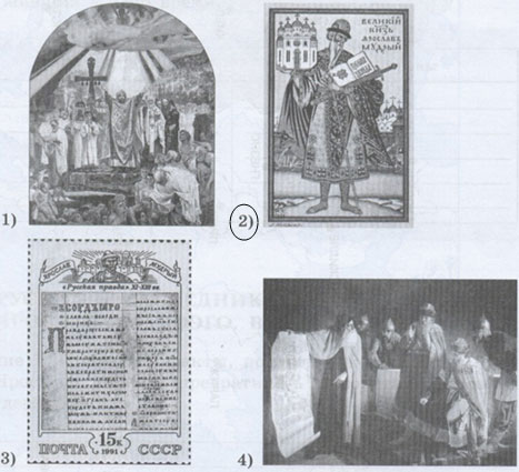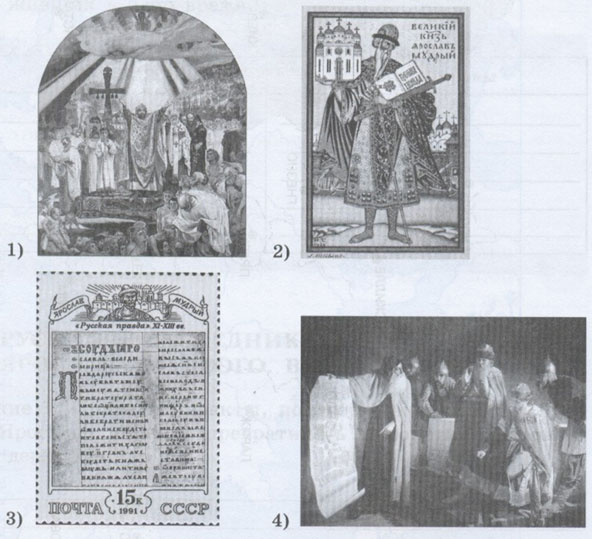 Задание 4. Какое из приведённых ниже изображений может служить наиболее полной иллюстрацией внутренней политики Ярослава Мудрого? Обведите порядковый номер подходящего изображения.