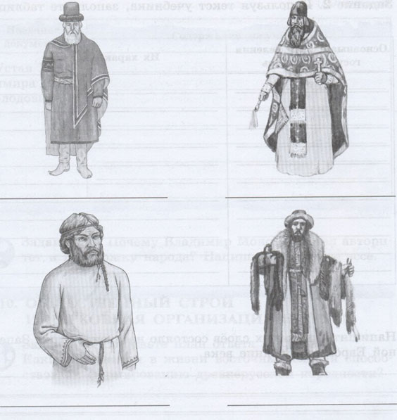 Задание 3. Рассмотрите иллюстрации на с. 48. Представителями каких слоёв населения Руси были изображённые на них люди? Под каждым изображением запишите название общественного слоя.