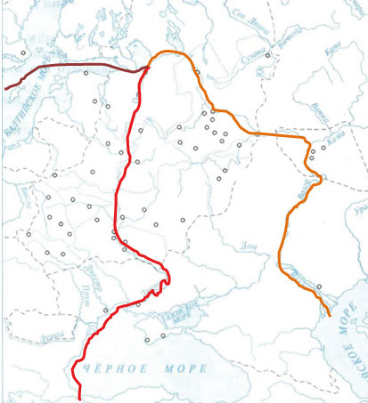 Основные торговые пути, идущие через Новгород: "из варяг в греки" (красная линия); путь к Балтийскому морю (коричневая линия); Волжский путь (рыжая линия).