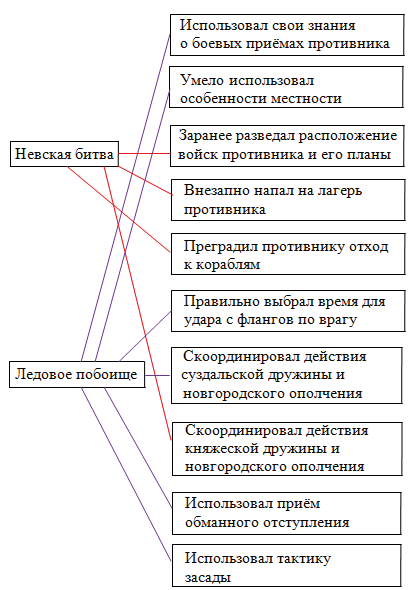 Задание 3. Проведите соединительные линии двух цветов в схеме "Полководческое искусство Александра Невского".