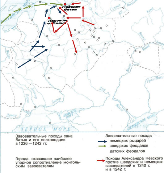 Задание 8. На контурной карте (с. 72) обозначьте стрелками разного цвета направления походов крестоносцев и Александра Невского, значками - места Невской битвы и Ледового побоища.