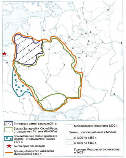 Задание 3. На контурной карте заштрихуйте разными цветами и обозначьте: 1) литовские земли в начале XIII в.; 2) земли Западной и Южной Руси, отошедшие к Литве в XIII-XV вв.; 3) земли Галицко-Волынского княжества, отошедшие к Польше в XIV в.; 4) место Грюнвальдской битвы; 5) границы Великого княжества Литовского в 1462 г.