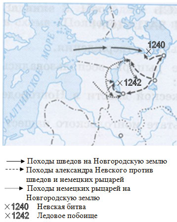 Задание 8. Поработайте с картой на с. 93. Подпишите в легенде, чьи войска совершили походы, обозначенные на карте чёрными стрелками. Укажите места Невской битвы и Ледового побоища, запишите годы этих сражений.