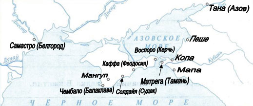 Задание 1. Обозначьте на контурной карте генуэзские города в Северном Причерноморье.