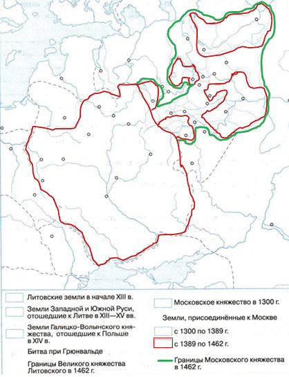 Задание 8. На контурной карте (с. 83) закрасьте земли, присоединённые к Москве в 1389 - 1462 гг., обведите границы Московского княжества в 1462 г.
