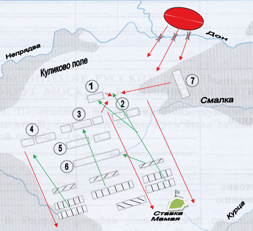 Задание 4. Подпишите названия рек и поля, на котором сосредоточены войска. Подпишите на схеме русский стан и закрасьте его красным цветом. Подпишите ставку Мамая и закрасьте её зелёным цветом. Используя информацию из легенды, соответствующими цифрами обозначьте на схеме расположение русских войск; соответствующими штриховками укажите расположение ордынских войск. Стрелками покажите направления действий русских (красным цветом) и ордынских (зелёным цветом) войск.