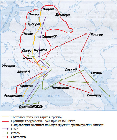 Задание 8. Подпишите на карте на с. 32 названия городов. Жёлтым цветом нанесите торговый путь "из варяг в греки". Красным цветом обведите границы государства Русь. При каком князе оформились эти границы? Стрелками разного цвета покажите направления походов Олега, Игоря, Святослава. Заполните легенду: отразите в ней информацию, которую вы нанесли на карту.