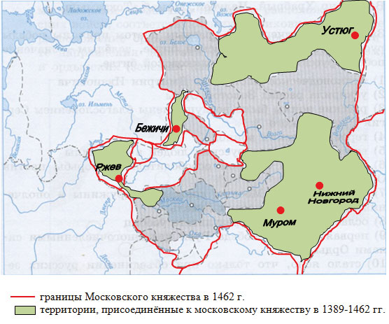 Задание 6. На карте на с. 110 красным цветом обведите границы Московского княжества в 1462 г. Зелёным цветом закрасьте территории, присоединённые к московскому княжеству в 1389-1462 гг. Подпишите названия городов на присоединённых землях. Заполните легенду карты.