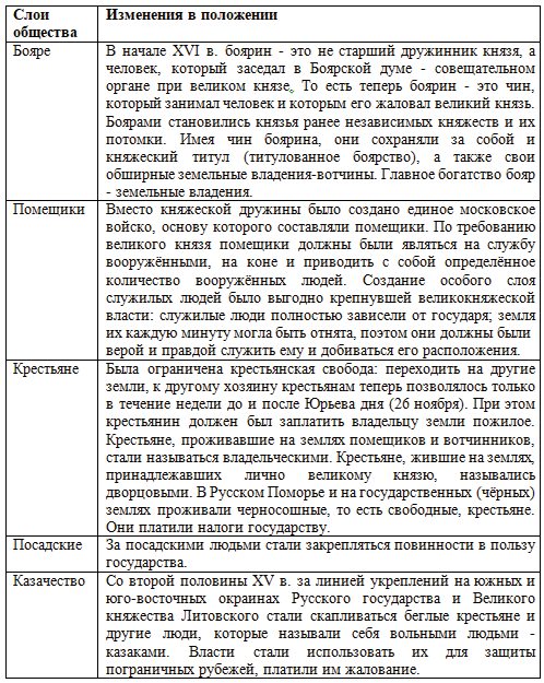 Задание 2. Заполните таблицу "Изменения в положении различных слоёв русского общества во второй половине XV в.".