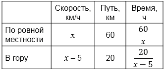 Велосипедист проехал \(20\) км по дороге, ведущей в гору, и \(60\) км по ровной местности, затратив на весь путь \(6\) ч. С какой скоростью ехал велосипедист на каждом участке пути, если известно, что в гору он ехал со скоростью, на \(5\) км/ч меньшей, чем по ровной местности?