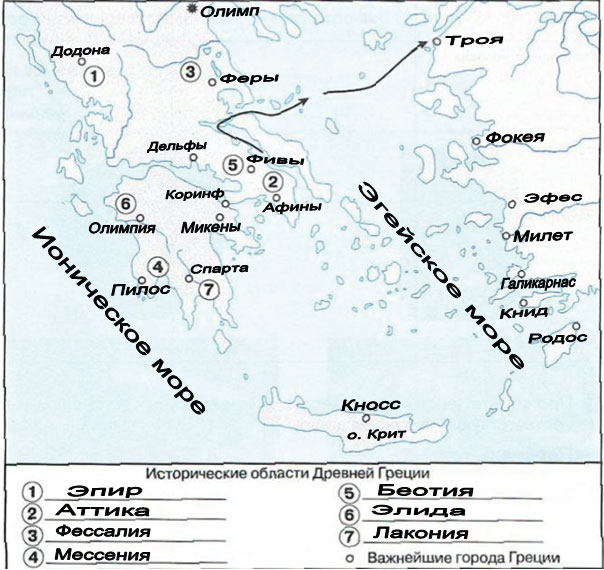 2) Подпишите в легенде названия исторических областей Древней Греции, обозначенных на карте цифрами.