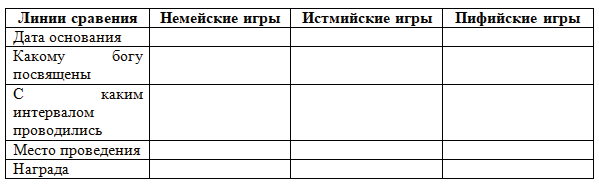 Популярность Олимпийских игр привела к возникновению ещё нескольких общегреческих игр. В 573 г. до н. э. были основаны Немейские игры, посвящённые Зевсу. Они проводились раз в два года на Немейской равнине в области Арголида (Пелопоннес).В 582 г. до н. э. появились Истмийские игры, они устраивались в честь Посейдона раз в два года на Истме (Коринфском перешейке). В 590 г. до н. э. при святилище Аполлона в Дельфах стали проводить Пифийские игры. Сначала раз в восемь лет, а затем раз в четыре года. Пифийские игры зародились как музыкальные состязания, т. е. соревнования певцов в сопровождении игры на кифаре, темой которых была победа Аполлона над змеем Пифоном. Начиная с IV (4) в. до н. э. музыкальные состязания были включены в Истмийские и Немейские игры. Так как эти игры создавались по примеру Олимпийских игр, то наградой на них также стал священный венок: на Пифийских играх - из лавра, на Истмийских играх - из сосны, на Немейских играх - из сельдерея.