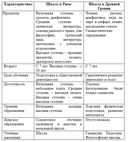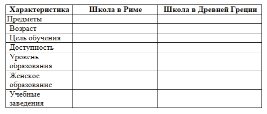 3. Сравните образование в Древней Греции и в Древнем Риме. Заполните таблицу.