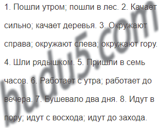 1. Тёплым утром мы пошли в лес. 2. Ветер сильно качает деревья. 3. Справа и слева дорогу окружают горы. 4. Первые гости пришли в семь часов. 6. библиотека работает с утра до вечера. 7. Море бушевало два дня. 8. В страдную пору полевые работы идут с восхода до захода солнца.