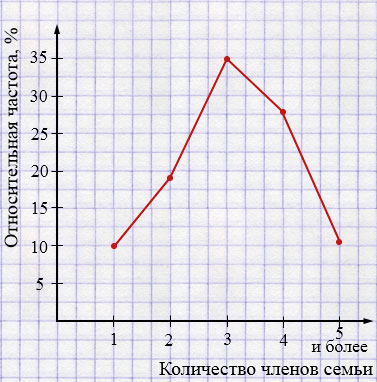 Полигон — это график в виде ломаной линии, отображающий, как изменяется относительная частота в зависимости от значения признака (здесь — количества членов семьи).