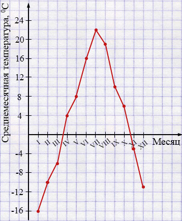 | Среднемесячная температура, °C | -16 | -10 | -6 | 4 | 8 | 16 | 22 | 19 | 10 | 6 | -3 | -11 |