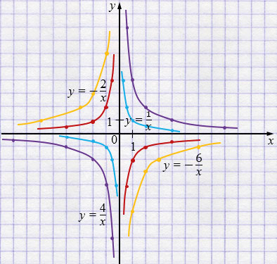 \(y = \dfrac{1}{x},\quad y = \dfrac{4}{x},\quad y = -\dfrac{2}{x},\quad y = -\dfrac{6}{x}.\)