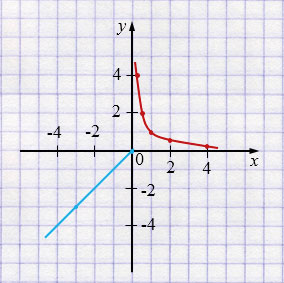 Функция кусочная: для \(x\le 0\) это прямая \(y=x\) (берём часть слева от нуля включительно, точка \((0,0)\) входит); для \(x>0\) — ветвь гиперболы \(y=\dfrac1x\) в первой четверти (ноль в область не входит).
