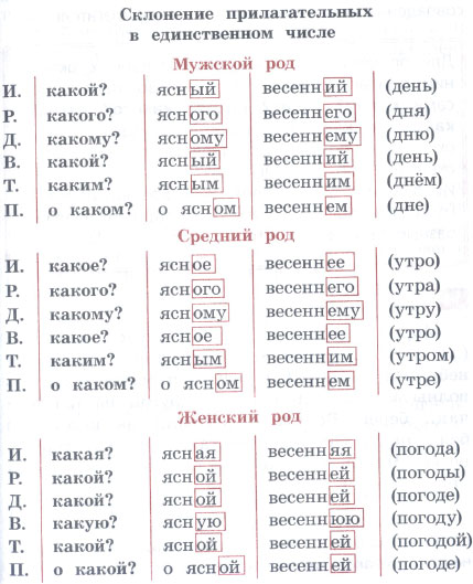 1. Прочитайте. Сравните окончания прилагательных в каждом падеже с окончаниями вопросов.
