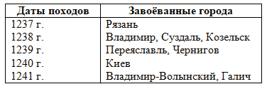 1. Заполните в тетради хронологическую таблицу "Походы Батыя на Русь".
