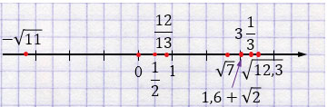 \(\sqrt{7};\; -\sqrt{11};\; \sqrt{12{,}3};\; \dfrac{12}{13};\)