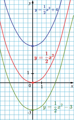 \( y=\tfrac12 x^2+4 \): вершина: \((0; 4)\), ветви вверх.