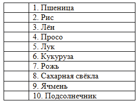 1. Отметьте названия сельскохозяйственных культур, которые выращивали славяне.
