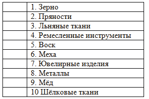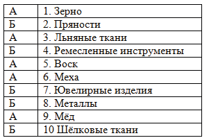 1. Отметьте буквами товары: А - которые вывозили из Русской земли, Б - которые привозили на Русь.