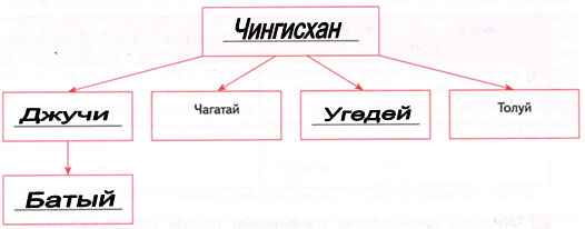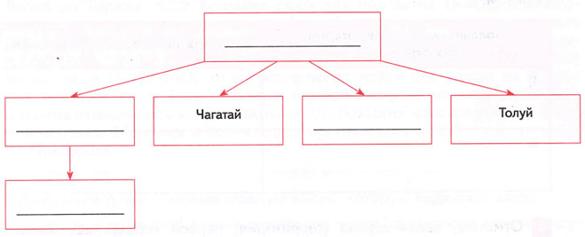 1. Заполните схему, используя имена Батый, Джучи, Чингисхан, Угедей.