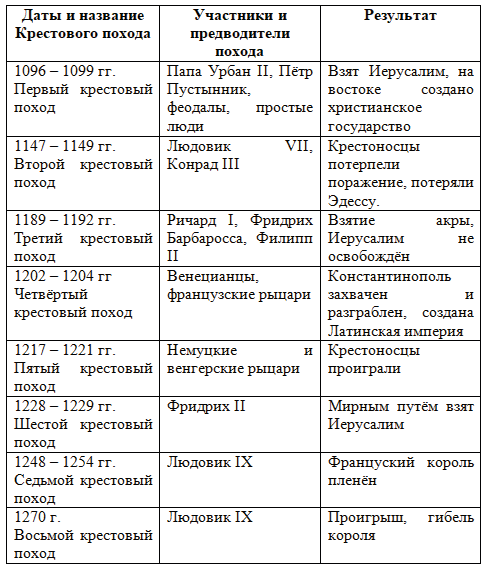 5. Заполните таблицу "Крестовые походы XI - XIII вв.".