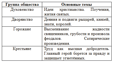 - активное развитие литературы. Многообразие жанров литературы: религиозные трактаты и поучения, жития святых, рыцарские романы, сказания о великих воинах прошлого, новеллы, рассказы, басни, сатирические песни и стихи;