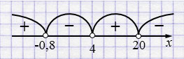 Ответ: \(x \in (-0,8; 4) \cup (20; +\infty)\).