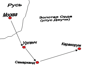1) Карта-схема поездки русского князя в столицу монгольской державы в конце XIII в.