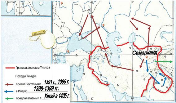 Рассмотрите контурную карту "Многоликое Средневековье. Держава Тимура" и выполните задания.