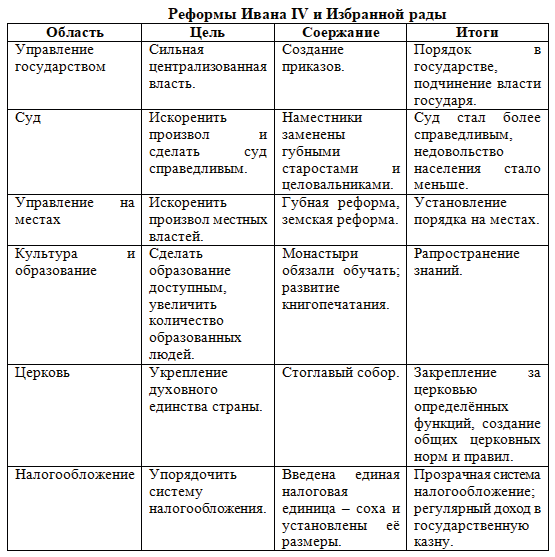 4. Составьте и заполните в тетради таблицу "Реформы Ивана IV и Избранной рады". Укажите в ней цели, содержание и итоги преобразований.