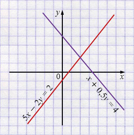 б) \(\begin{cases} 5x - 2y = 2,\\ x + 0{,}5y = 4. \end{cases}\)
