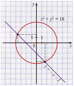 а) \(\begin{cases} x^2+y^2=16,\\ x+y+2=0 \end{cases}\)