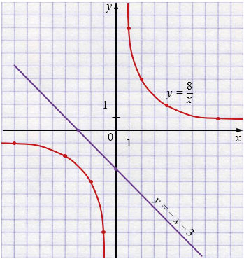 \(\begin{cases} y=\frac8x,\\ y=-x-3 \end{cases}\)
