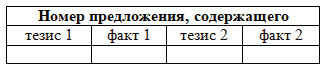 6. Прочитайте четыре предложения. Два из них являются тезисами (положениями, которые требуется аргументировать). Другие два содержат факты, которые могут послужить для аргументации этих тезисов. Подберите для каждого из тезисов соответствующий ему факт. Номера соответствующих предложений запишите в таблицу.