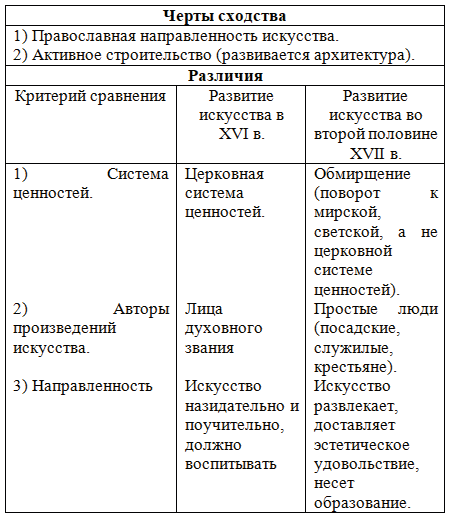 10. Сравните развитие искусства в XVI в. и во второй половине XVII в. Заполните таблицу.