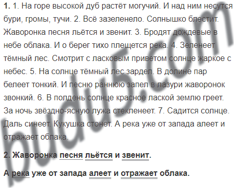 1. На горе высокой дуб растёт могучий, и над ним несутся бури, громы, тучи. (Ф. Шкулёв) 2. Всё зазеленело, солнышко блестит, жаворонка песня льётся и звенит. 3. Бродят дождевые в небе облака, и о берег тихо плещется река. 4. Зеленеет тёмный лес, смотрит с ласковым приветом солнце жаркое с небес. (С. Дрожжин) 5. На солнце тёмный лес зардел, в долине пар белеет тонкий, и песню раннюю запел в лазури жаворонок звонкий. (В. Жуковский) 6. В полдень солнце красное лаской землю греет, за ночь звёздно-ясную лужа стекленеет. (О. Беляевская) 7. Садится солнце, даль синеет, кукушка стонет, а река уже от запада алеет и отражает облака (И. Бунин)