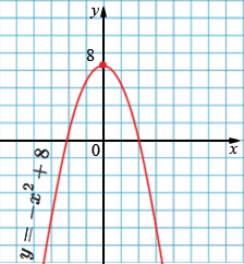в) Графиком функции \( y = -x^2 + 8\) является парабола \(y = x^{2}\), сдвинутая вверх на 8 единиц и отражённая относительно оси \(x\). Вершина: \((0; 8)\). Ветви направлены вниз.