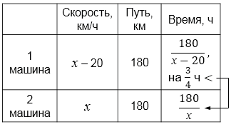 Две автомашины отправились одновременно из села в город, который удалён на \(180\) км. Одна автомашина пришла в город на \(45\) мин позже другой, так как её скорость была на \(20\) км/ч меньше. С какой скоростью шла каждая автомашина?