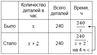 После усовершенствования он стал работать быстрее — по \(x+2\) детали в час. Тогда новое время выполнения работы равно \(\frac{240}{x+2}\).
