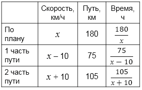 Фактически первые \(75\) км он ехал медленнее на \(10\) км/ч, то есть со скоростью \(x-10\), а оставшиеся \(105\) км — быстрее на \(10\) км/ч, то есть со скоростью \(x+10\).