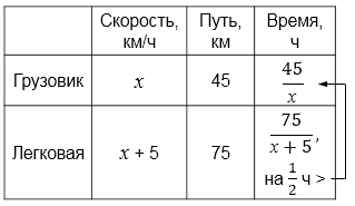 Пусть скорость грузовика \(x\) км/ч. Тогда скорость легковой автомашины на \(5\) км/ч больше и равна \(x+5\) км/ч.