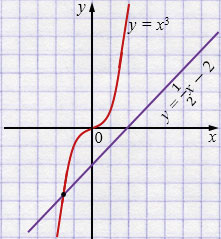 а) Левая часть — прямая \(y=\frac{1}{2}x-2\), правая — кубическая функция \(y=x^3\). Кубическая функция непрерывна и принимает как отрицательные, так и положительные значения. Поскольку значения выражения меняют знак, графики пересекаются хотя бы в одной точке.