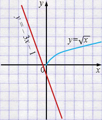 б) Правая часть \(\sqrt{x}\) определена только при \(x\ge 0\) и всегда неотрицательна. Левая часть \(-3x-1\) при \(x\ge 0\) всегда отрицательна. Следовательно, графики не пересекаются.